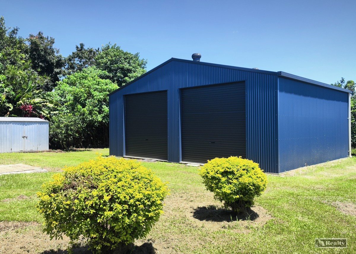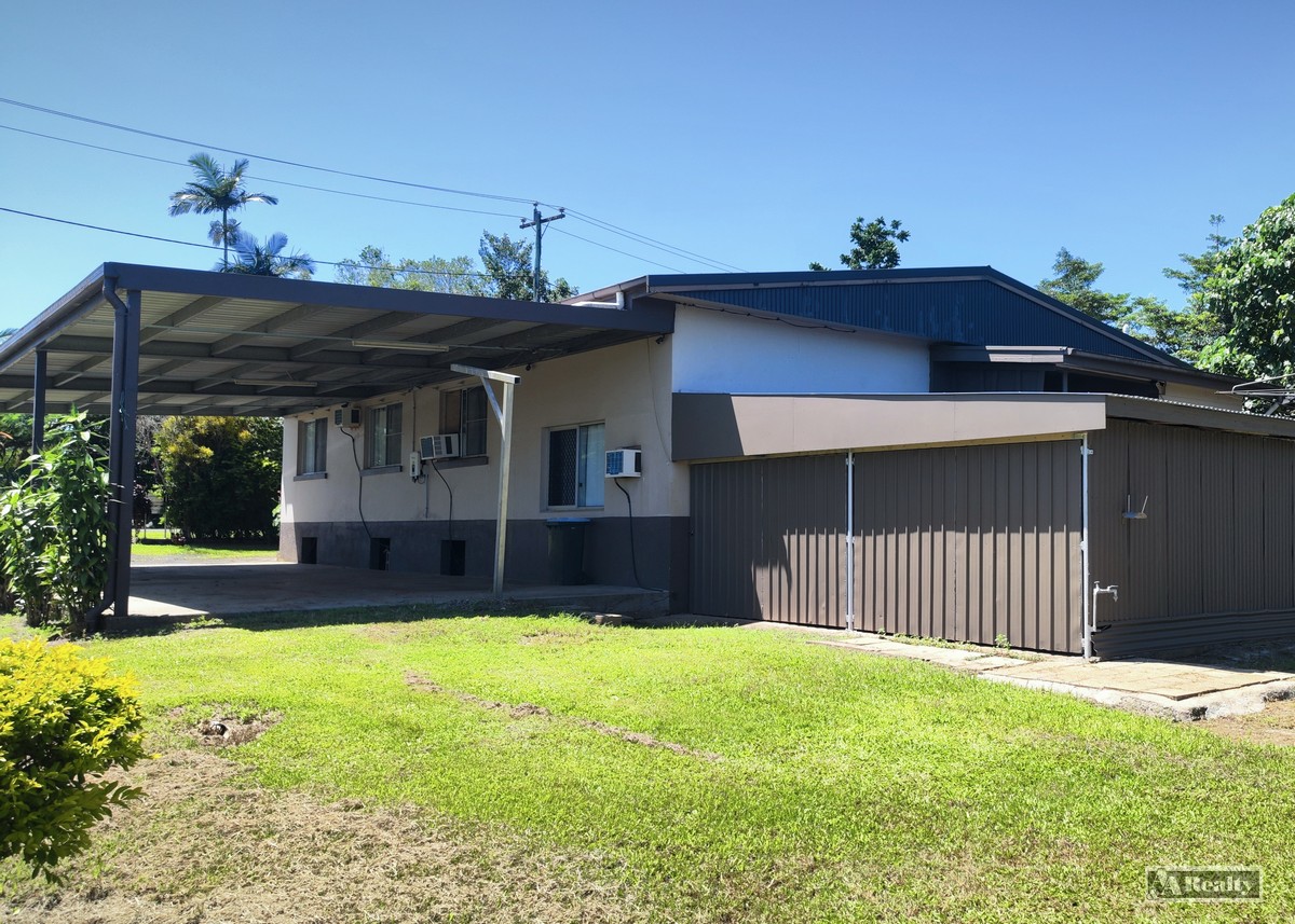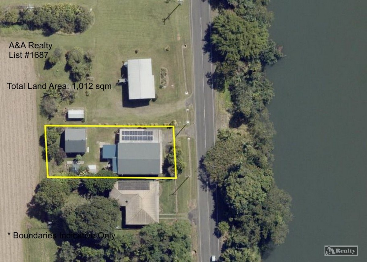 Four bedrooms. One bathroom. Tiled front patio. Large laundry area. Work studio and garden shed. 6 car carport. 8 x 9 metre* 2 bay enclosed shed. 24 solar panels. 3km* to the Innisfail CBD. South Johnstone River across the road.