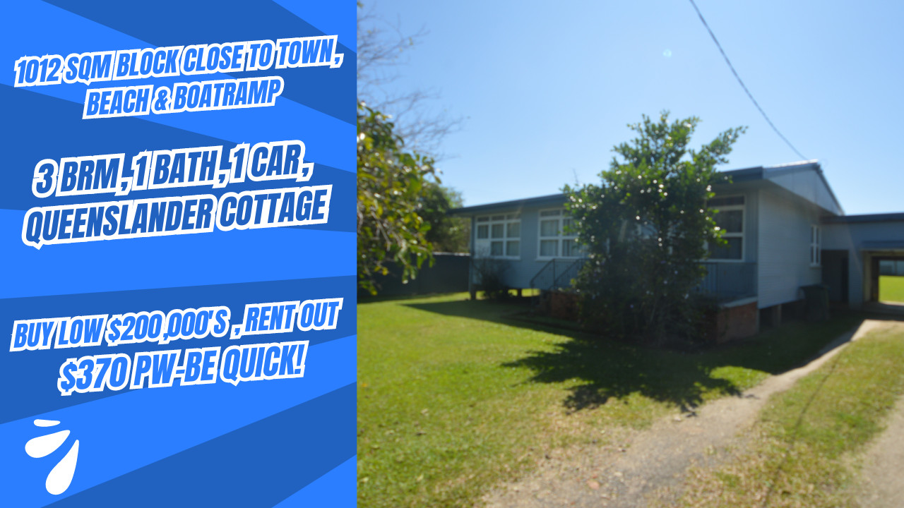 ONLY $210K- FLOOD FREE! 1012 SQM BLOCK CLOSE TO TOWN, BEACH & BOATRAMP, 3 BRM, 1 BATH, 1 CAR, QUEENSLANDER COTTAGE- BUY $210,000-FIRM