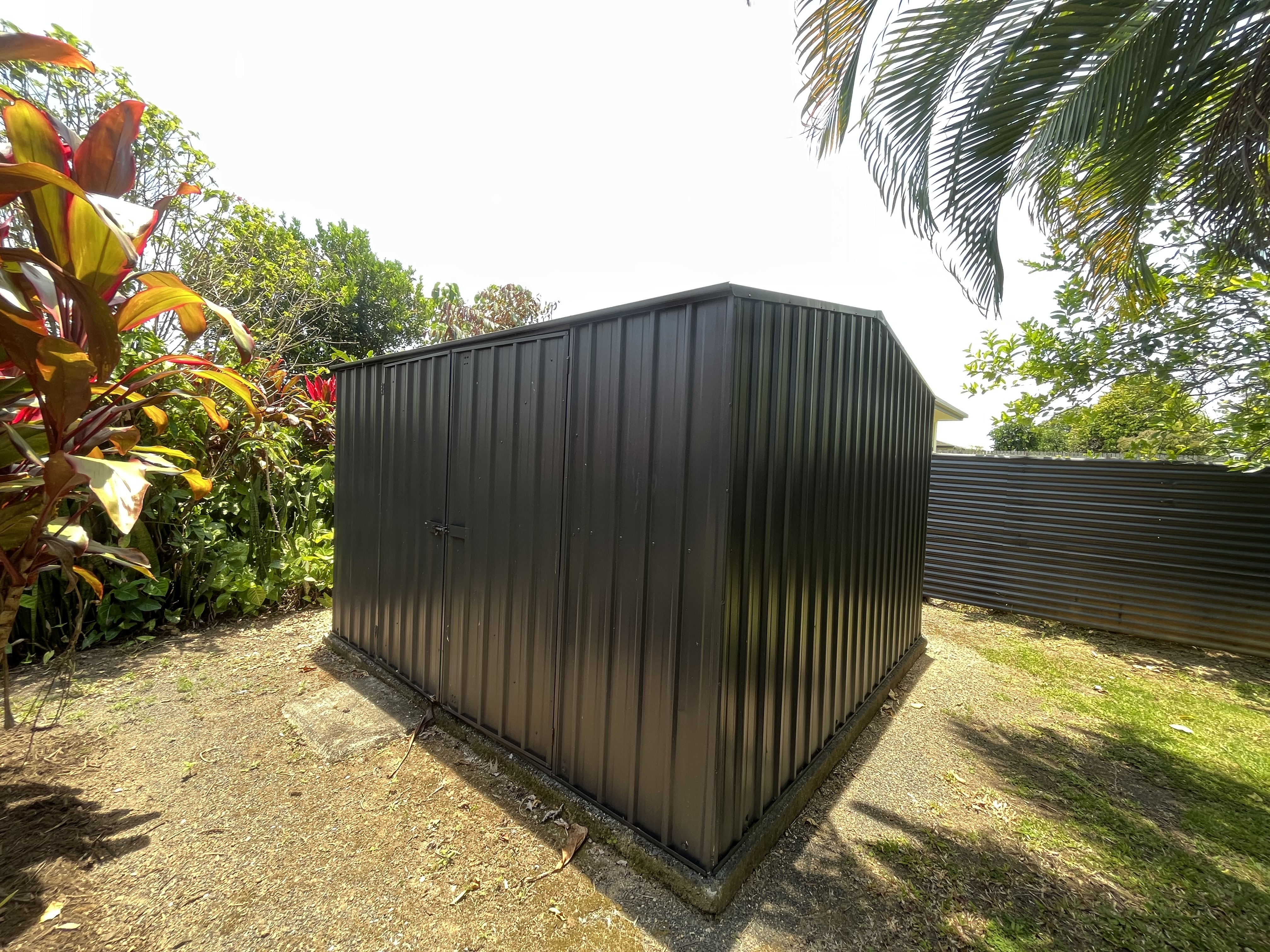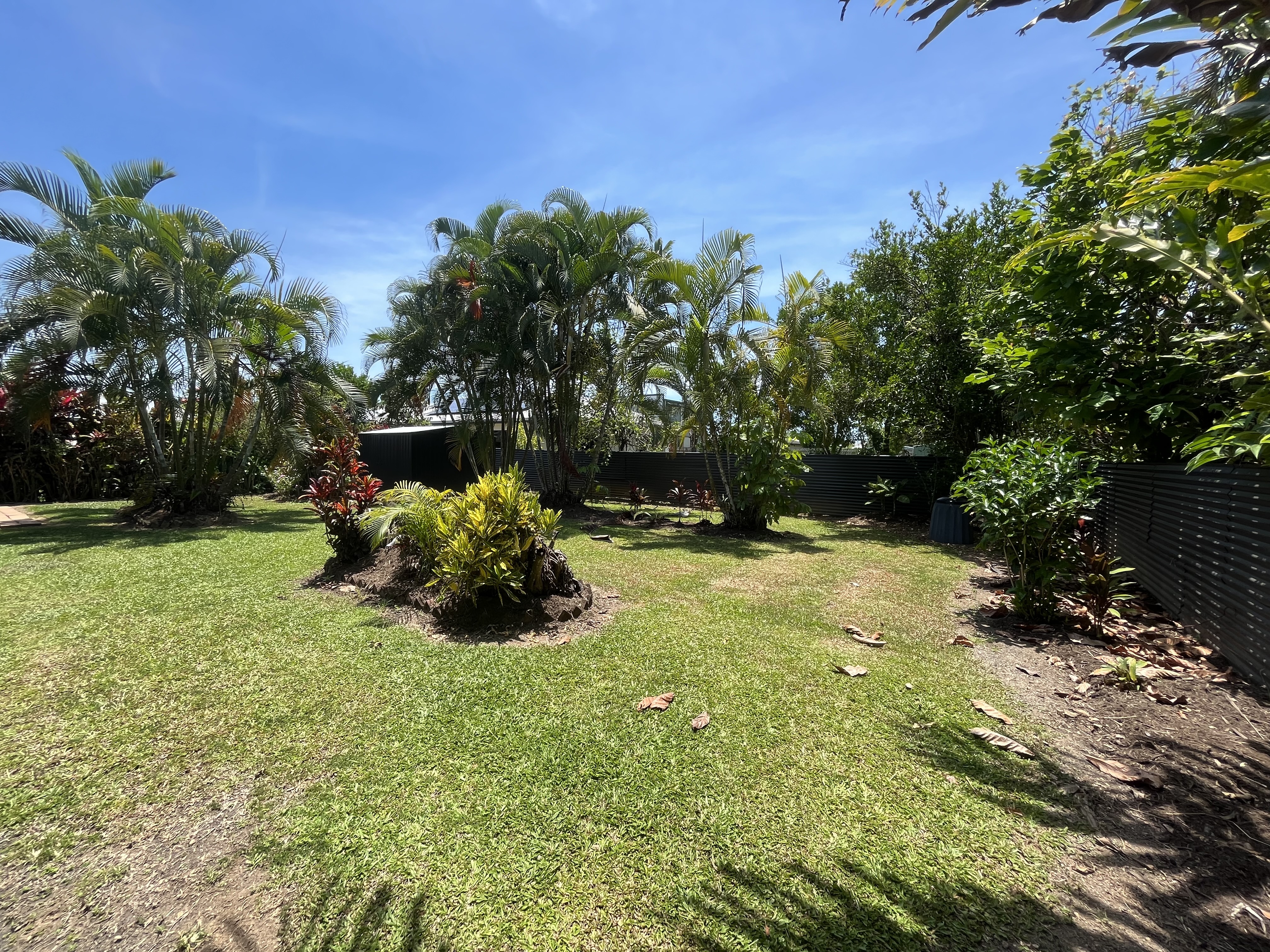 * back yard with grass, minimum trees and a small garden shed